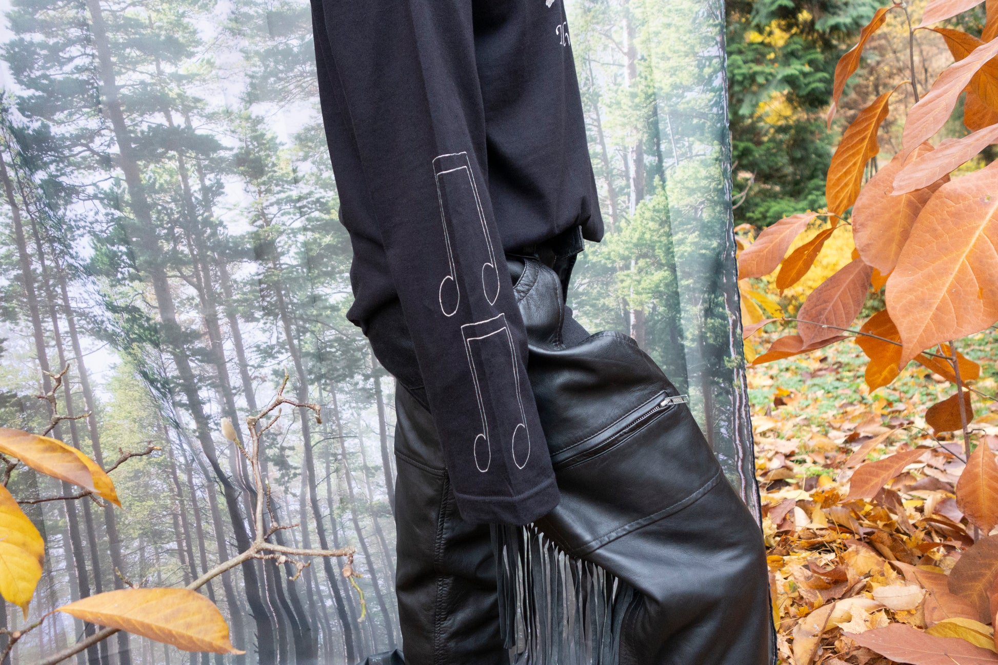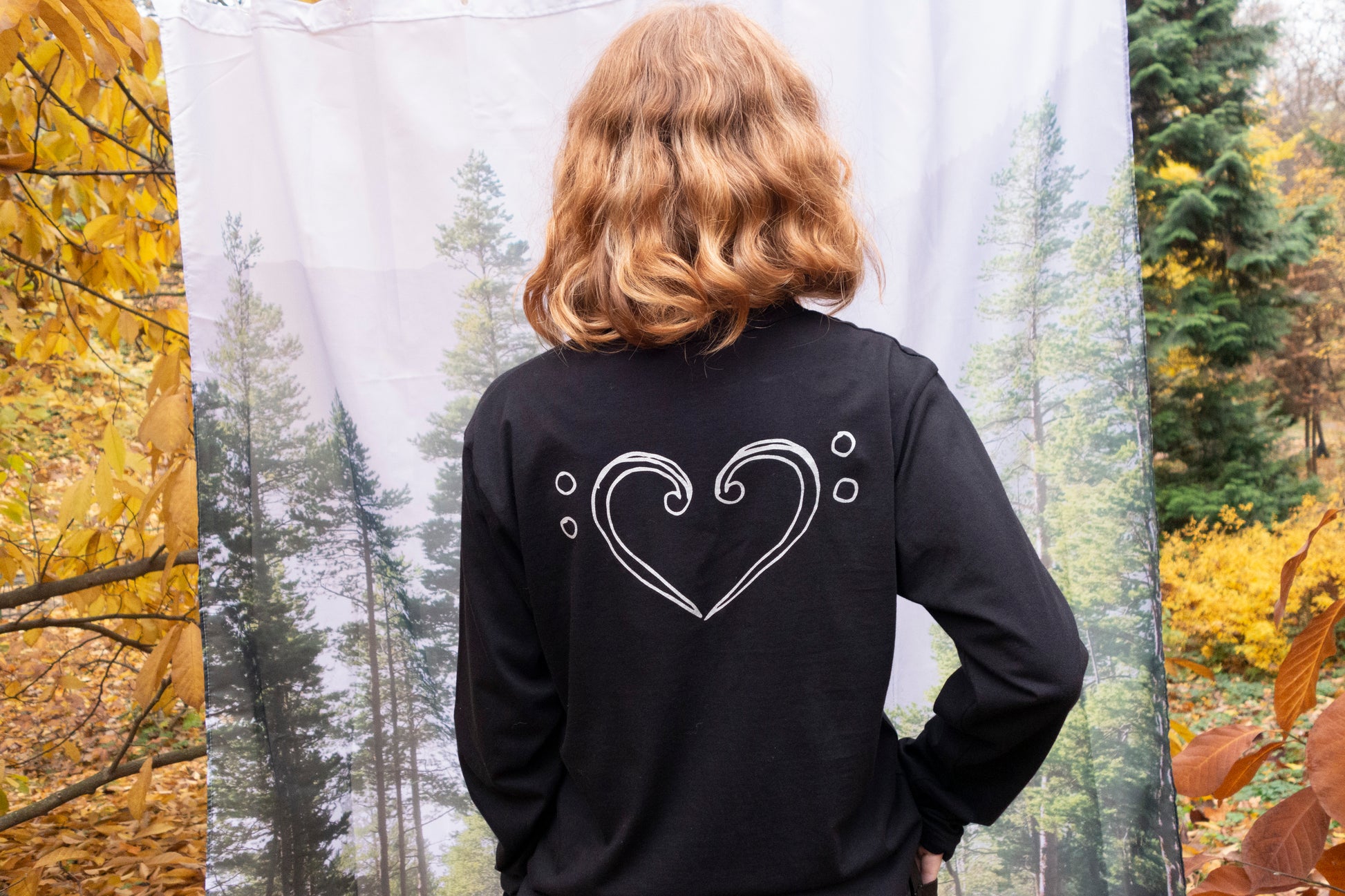 Black longsleeve with silver silscreen prints on the front, sleeve and the back, forever inspired by THE MUSIC.